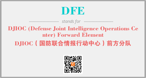 上述内容是“DJIOC (Defense Joint Intelligence Operations Center) Forward Element”作为“DFE”的缩写,解释为“DJIOC(国防联合情报行动中心)前方分队”时的信息,以及英文缩略词DFE所代表的英文单词,其对应的中文拼音、详细解释以及在英文中的流行度和相关分类、应用领域及应用示例等。