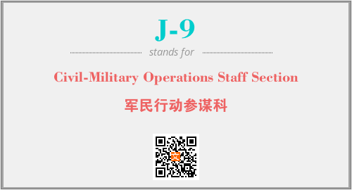 英文缩略词“J-9”经常作为“Civil-Military Operations Staff Section”的英文缩写来使用,中文表示:“军民行动参谋科”。本文将详细介绍英文缩写词J-9所代表英文单词,其对应的中文拼音、详细解释以及在英语中的流行度。此外,还有关于缩略词J-9的分类、应用领域及相关应用示例等。