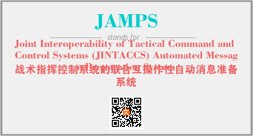 英文缩略词“JAMPS”经常作为“Joint Interoperability of Tactical Command and Control Systems (JINTACCS) Automated Message Preparation System”的英文缩写来使用,中文表示:“战术指挥控制系统的联合互操作性自动消息准备系统”。本文将详细介绍英文缩写词JAMPS所代表英文单词,其对应的中文拼音、详细解释以及在英语中的流行度。此外,还有关于缩略词JAMPS的分类、应用领域及相关应用示例等。