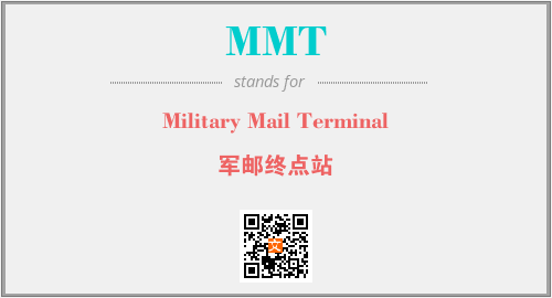 英文缩略词“MMT”经常作为“Military Mail Terminal”的英文缩写来使用,中文表示:“军邮终点站”。本文将详细介绍英文缩写词MMT所代表英文单词,其对应的中文拼音、详细解释以及在英语中的流行度。此外,还有关于缩略词MMT的分类、应用领域及相关应用示例等。