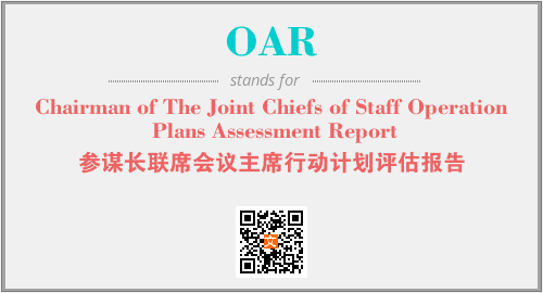 上述内容是“Chairman of The Joint Chiefs of Staff Operation Plans Assessment Report”作为“OAR”的缩写,解释为“参谋长联席会议主席行动计划评估报告”时的信息,以及英文缩略词OAR所代表的英文单词,其对应的中文拼音、详细解释以及在英文中的流行度和相关分类、应用领域及应用示例等。