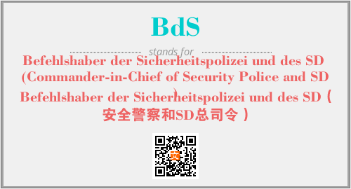 上述内容是“Befehlshaber der Sicherheitspolizei und des SD (Commander-in-Chief of Security Police and SD)”作为“BdS”的缩写,解释为“Befehlshaber der Sicherheitspolizei und des SD(安全警察和SD总司令)”时的信息,以及英文缩略词BdS所代表的英文单词,其对应的中文拼音、详细解释以及在英文中的流行度和相关分类、应用领域及应用示例等。