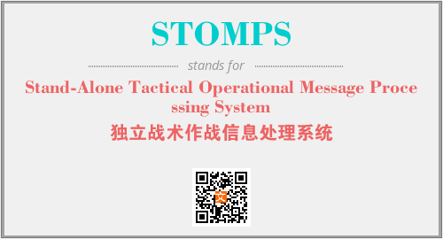 上述内容是“Stand-Alone Tactical Operational Message Processing System”作为“STOMPS”的缩写,解释为“独立战术作战信息处理系统”时的信息,以及英文缩略词STOMPS所代表的英文单词,其对应的中文拼音、详细解释以及在英文中的流行度和相关分类、应用领域及应用示例等。