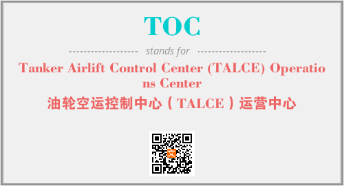上述内容是“Tanker Airlift Control Center (TALCE) Operations Center”作为“TOC”的缩写,解释为“油轮空运控制中心(TALCE)运营中心”时的信息,以及英文缩略词TOC所代表的英文单词,其对应的中文拼音、详细解释以及在英文中的流行度和相关分类、应用领域及应用示例等。