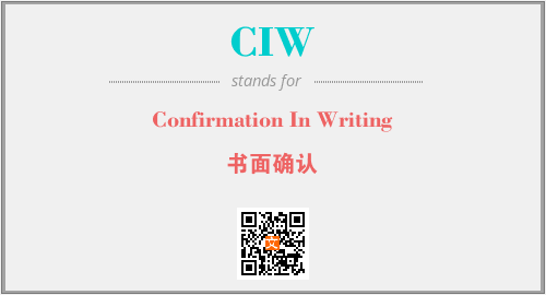 英文缩略词“CIW”经常作为“Confirmation In Writing”的英文缩写来使用,中文表示:“书面确认”。本文将详细介绍英文缩写词CIW所代表英文单词,其对应的中文拼音、详细解释以及在英语中的流行度。此外,还有关于缩略词CIW的分类、应用领域及相关应用示例等。