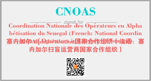 以上为Coordination Nationale des Opérateurs en Alphabétisation du Senegal (French: National Coordination of Operators in Literacy of Senegal)英文缩略词CNOAS的中文解释,以及该英文缩写在英语的流行度、分类和应用领域方面的信息。