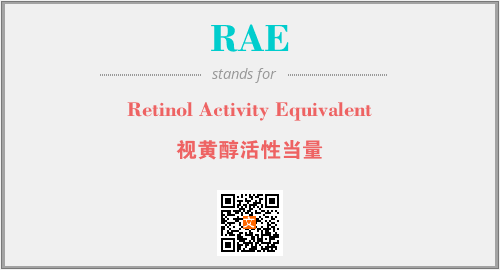 上述内容是“Retinol Activity Equivalent”作为“RAE”的缩写,解释为“视黄醇活性当量”时的信息,以及英文缩略词RAE所代表的英文单词,其对应的中文拼音、详细解释以及在英文中的流行度和相关分类、应用领域及应用示例等。