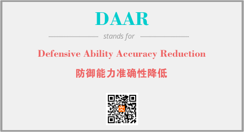 上述内容是“Defensive Ability Accuracy Reduction”作为“DAAR”的缩写,解释为“防御能力准确性降低”时的信息,以及英文缩略词DAAR所代表的英文单词,其对应的中文拼音、详细解释以及在英文中的流行度和相关分类、应用领域及应用示例等。