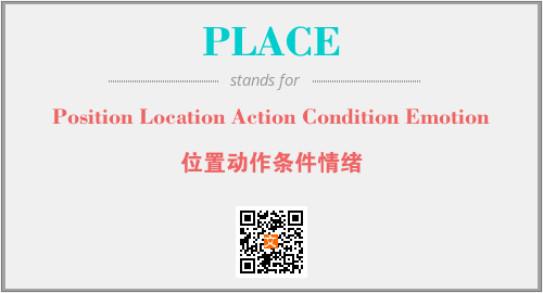上述内容是“Position Location Action Condition Emotion”作为“PLACE”的缩写,解释为“位置动作条件情绪”时的信息,以及英文缩略词PLACE所代表的英文单词,其对应的中文拼音、详细解释以及在英文中的流行度和相关分类、应用领域及应用示例等。