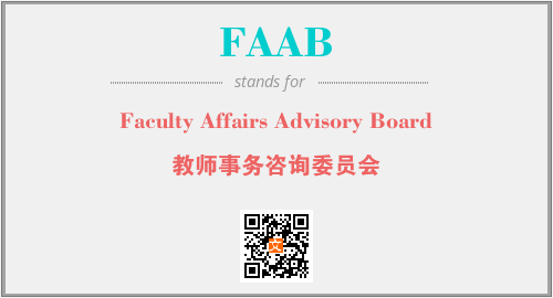 英文缩略词“FAAB”经常作为“Faculty Affairs Advisory Board”的英文缩写来使用,中文表示:“教师事务咨询委员会”。本文将详细介绍英文缩写词FAAB所代表英文单词,其对应的中文拼音、详细解释以及在英语中的流行度。此外,还有关于缩略词FAAB的分类、应用领域及相关应用示例等。