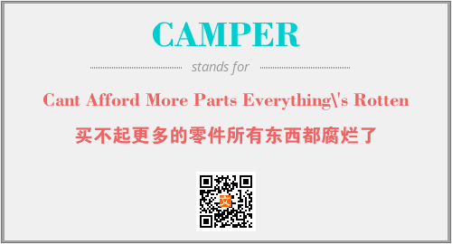 以上为Cant Afford More Parts Everything\'s Rotten英文缩略词CAMPER的中文解释,以及该英文缩写在英语的流行度、分类和应用领域方面的信息。