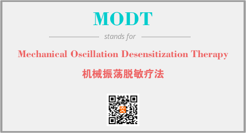 上述内容是“Mechanical Oscillation Desensitization Therapy”作为“MODT”的缩写,解释为“机械振荡脱敏疗法”时的信息,以及英文缩略词MODT所代表的英文单词,其对应的中文拼音、详细解释以及在英文中的流行度和相关分类、应用领域及应用示例等。