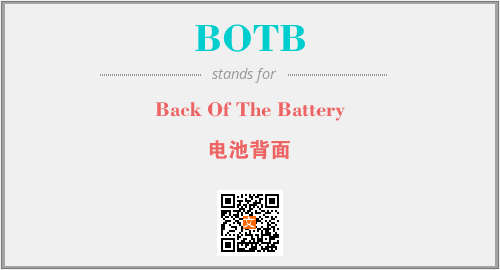 英文缩略词“BOTB”经常作为“Back Of The Battery”的英文缩写来使用,中文表示:“电池背面”。本文将详细介绍英文缩写词BOTB所代表英文单词,其对应的中文拼音、详细解释以及在英语中的流行度。此外,还有关于缩略词BOTB的分类、应用领域及相关应用示例等。