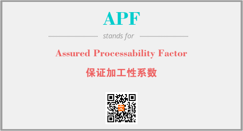 上述内容是“Assured Processability Factor”作为“APF”的缩写,解释为“保证加工性系数”时的信息,以及英文缩略词APF所代表的英文单词,其对应的中文拼音、详细解释以及在英文中的流行度和相关分类、应用领域及应用示例等。