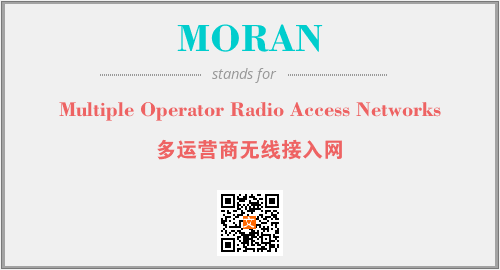上述内容是“Multiple Operator Radio Access Networks”作为“MORAN”的缩写,解释为“多运营商无线接入网”时的信息,以及英文缩略词MORAN所代表的英文单词,其对应的中文拼音、详细解释以及在英文中的流行度和相关分类、应用领域及应用示例等。