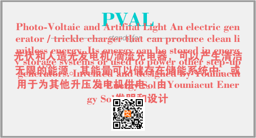 "PVAL - 光伏和人造光发电机/滴流充电器,可以产生清洁无限的能源。其能量可以储存在储能系统中,或用于为其他升压发电机供电。由Youniacut Energy Sol发明和设计 ." [引用日期]. <https://www.suoxie123.com/a/65678.html>.