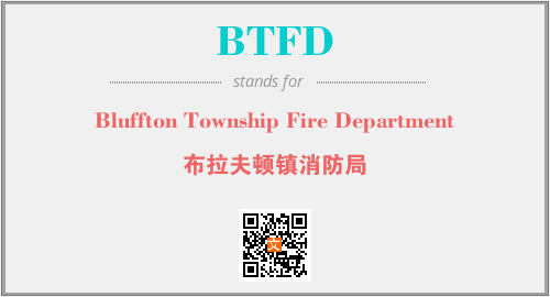 上述内容是“Bluffton Township Fire Department”作为“BTFD”的缩写,解释为“布拉夫顿镇消防局”时的信息,以及英文缩略词BTFD所代表的英文单词,其对应的中文拼音、详细解释以及在英文中的流行度和相关分类、应用领域及应用示例等。