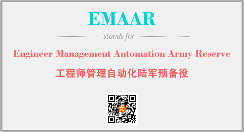 英文缩略词“EMAAR”经常作为“Engineer Management Automation Army Reserve”的英文缩写来使用,中文表示:“工程师管理自动化陆军预备役”。本文将详细介绍英文缩写词EMAAR所代表英文单词,其对应的中文拼音、详细解释以及在英语中的流行度。此外,还有关于缩略词EMAAR的分类、应用领域及相关应用示例等。
