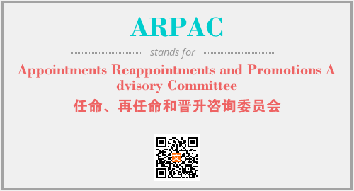 上述内容是“Appointments Reappointments and Promotions Advisory Committee”作为“ARPAC”的缩写,解释为“任命、再任命和晋升咨询委员会”时的信息,以及英文缩略词ARPAC所代表的英文单词,其对应的中文拼音、详细解释以及在英文中的流行度和相关分类、应用领域及应用示例等。