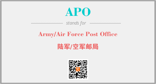 英文缩略词“APO”经常作为“Army/Air Force Post Office”的英文缩写来使用,中文表示:“陆军/空军邮局”。本文将详细介绍英文缩写词APO所代表英文单词,其对应的中文拼音、详细解释以及在英语中的流行度。此外,还有关于缩略词APO的分类、应用领域及相关应用示例等。