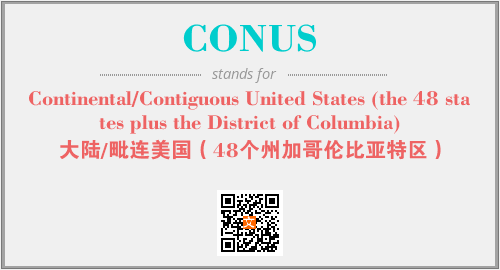 上述内容是“Continental/Contiguous United States (the 48 states plus the District of Columbia)”作为“CONUS”的缩写,解释为“大陆/毗连美国(48个州加哥伦比亚特区)”时的信息,以及英文缩略词CONUS所代表的英文单词,其对应的中文拼音、详细解释以及在英文中的流行度和相关分类、应用领域及应用示例等。