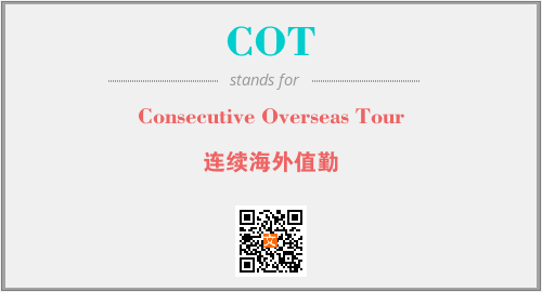 英文缩略词“COT”经常作为“Consecutive Overseas Tour”的英文缩写来使用,中文表示:“连续海外值勤”。本文将详细介绍英文缩写词COT所代表英文单词,其对应的中文拼音、详细解释以及在英语中的流行度。此外,还有关于缩略词COT的分类、应用领域及相关应用示例等。
