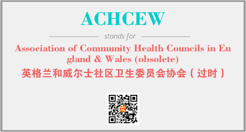 上述内容是“Association of Community Health Councils in England & Wales (obsolete)”作为“ACHCEW”的缩写,解释为“英格兰和威尔士社区卫生委员会协会(过时)”时的信息,以及英文缩略词ACHCEW所代表的英文单词,其对应的中文拼音、详细解释以及在英文中的流行度和相关分类、应用领域及应用示例等。