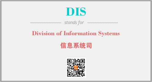 上述内容是“Division of Information Systems”作为“DIS”的缩写,解释为“信息系统司”时的信息,以及英文缩略词DIS所代表的英文单词,其对应的中文拼音、详细解释以及在英文中的流行度和相关分类、应用领域及应用示例等。