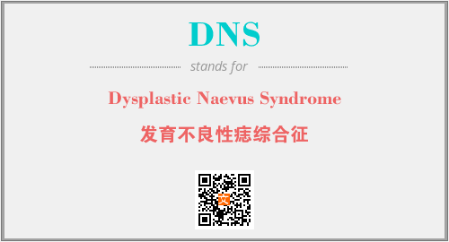 上述内容是“Dysplastic Naevus Syndrome”作为“DNS”的缩写,解释为“发育不良性痣综合征”时的信息,以及英文缩略词DNS所代表的英文单词,其对应的中文拼音、详细解释以及在英文中的流行度和相关分类、应用领域及应用示例等。