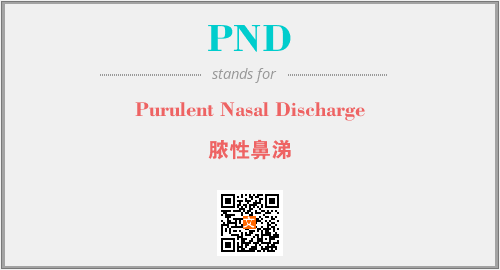 英文缩略词“PND”经常作为“Purulent Nasal Discharge”的英文缩写来使用,中文表示:“脓性鼻涕”。本文将详细介绍英文缩写词PND所代表英文单词,其对应的中文拼音、详细解释以及在英语中的流行度。此外,还有关于缩略词PND的分类、应用领域及相关应用示例等。