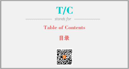 英文缩略词“T/C”经常作为“Table of Contents”的英文缩写来使用,中文表示:“目录”。本文将详细介绍英文缩写词T/C所代表英文单词,其对应的中文拼音、详细解释以及在英语中的流行度。此外,还有关于缩略词T/C的分类、应用领域及相关应用示例等。