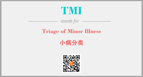 英文缩略词“TMI”经常作为“Triage of Minor Illness”的英文缩写来使用,中文表示:“小病分类”。本文将详细介绍英文缩写词TMI所代表英文单词,其对应的中文拼音、详细解释以及在英语中的流行度。此外,还有关于缩略词TMI的分类、应用领域及相关应用示例等。