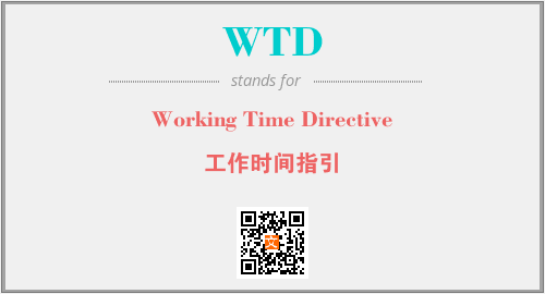 上述内容是“Working Time Directive”作为“WTD”的缩写,解释为“工作时间指引”时的信息,以及英文缩略词WTD所代表的英文单词,其对应的中文拼音、详细解释以及在英文中的流行度和相关分类、应用领域及应用示例等。