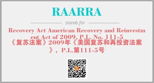 上述内容是“Recovery Act American Recovery and Reinvestment Act of 2009, P.L. No. 111-5”作为“RAARRA”的缩写,解释为“《复苏法案》2009年《美国复苏和再投资法案》,P.L.第111-5号”时的信息,以及英文缩略词RAARRA所代表的英文单词,其对应的中文拼音、详细解释以及在英文中的流行度和相关分类、应用领域及应用示例等。