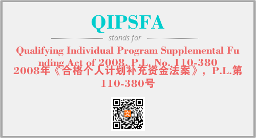 上述内容是“Qualifying Individual Program Supplemental Funding Act of 2008, P.L. No. 110-380”作为“QIPSFA”的缩写,解释为“2008年《合格个人计划补充资金法案》,P.L.第110-380号”时的信息,以及英文缩略词QIPSFA所代表的英文单词,其对应的中文拼音、详细解释以及在英文中的流行度和相关分类、应用领域及应用示例等。