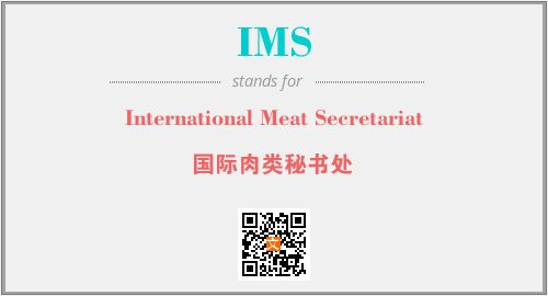 上述内容是“International Meat Secretariat”作为“IMS”的缩写,解释为“国际肉类秘书处”时的信息,以及英文缩略词IMS所代表的英文单词,其对应的中文拼音、详细解释以及在英文中的流行度和相关分类、应用领域及应用示例等。