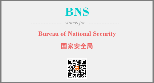 上述内容是“Bureau of National Security”作为“BNS”的缩写,解释为“国家安全局”时的信息,以及英文缩略词BNS所代表的英文单词,其对应的中文拼音、详细解释以及在英文中的流行度和相关分类、应用领域及应用示例等。