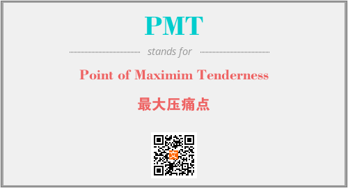 英文缩略词“PMT”经常作为“Point of Maximim Tenderness”的英文缩写来使用,中文表示:“最大压痛点”。本文将详细介绍英文缩写词PMT所代表英文单词,其对应的中文拼音、详细解释以及在英语中的流行度。此外,还有关于缩略词PMT的分类、应用领域及相关应用示例等。