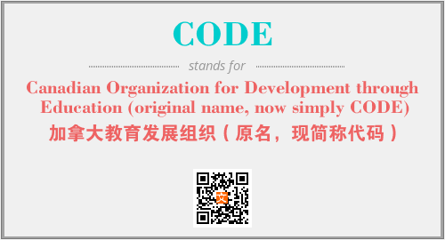 以上为Canadian Organization for Development through Education (original name, now simply CODE)英文缩略词CODE的中文解释,以及该英文缩写在英语的流行度、分类和应用领域方面的信息。