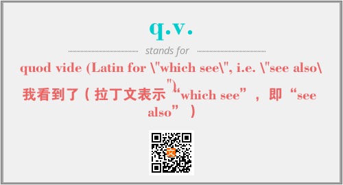 上述内容是“quod vide (Latin for \"which see\", i.e. \"see also\")”作为“q.v.”的缩写,解释为“我看到了(拉丁文表示“which see”,即“see also”)”时的信息,以及英文缩略词q.v.所代表的英文单词,其对应的中文拼音、详细解释以及在英文中的流行度和相关分类、应用领域及应用示例等。