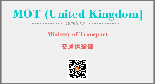 英文缩略词“MOT (United Kingdom]”经常作为“Ministry of Transport”的英文缩写来使用,中文表示:“交通运输部”。本文将详细介绍英文缩写词MOT (United Kingdom]所代表英文单词,其对应的中文拼音、详细解释以及在英语中的流行度。此外,还有关于缩略词MOT (United Kingdom]的分类、应用领域及相关应用示例等。