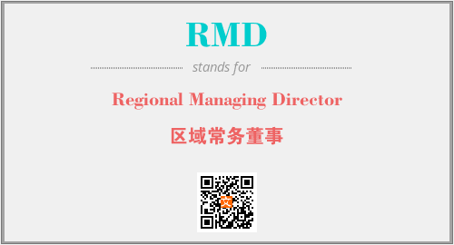 英文缩略词“RMD”经常作为“Regional Managing Director”的英文缩写来使用,中文表示:“区域常务董事”。本文将详细介绍英文缩写词RMD所代表英文单词,其对应的中文拼音、详细解释以及在英语中的流行度。此外,还有关于缩略词RMD的分类、应用领域及相关应用示例等。