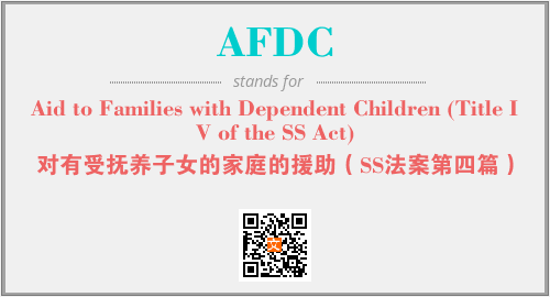 上述内容是“Aid to Families with Dependent Children (Title IV of the SS Act)”作为“AFDC”的缩写,解释为“对有受抚养子女的家庭的援助(SS法案第四篇)”时的信息,以及英文缩略词AFDC所代表的英文单词,其对应的中文拼音、详细解释以及在英文中的流行度和相关分类、应用领域及应用示例等。