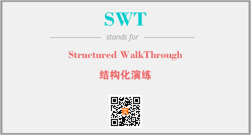 英文缩略词“SWT”经常作为“Structured WalkThrough”的英文缩写来使用,中文表示:“结构化演练”。本文将详细介绍英文缩写词SWT所代表英文单词,其对应的中文拼音、详细解释以及在英语中的流行度。此外,还有关于缩略词SWT的分类、应用领域及相关应用示例等。