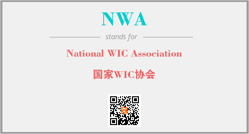 上述内容是“National WIC Association”作为“NWA”的缩写,解释为“国家WIC协会”时的信息,以及英文缩略词NWA所代表的英文单词,其对应的中文拼音、详细解释以及在英文中的流行度和相关分类、应用领域及应用示例等。