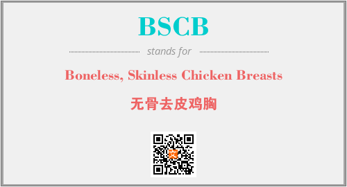 上述内容是“Boneless, Skinless Chicken Breasts”作为“BSCB”的缩写,解释为“无骨去皮鸡胸”时的信息,以及英文缩略词BSCB所代表的英文单词,其对应的中文拼音、详细解释以及在英文中的流行度和相关分类、应用领域及应用示例等。