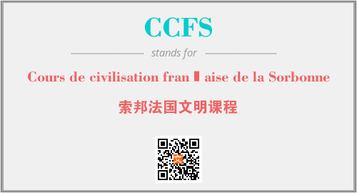 英文缩略词“CCFS”经常作为“Cours de civilisation française de la Sorbonne”的英文缩写来使用,中文表示:“索邦法国文明课程”。本文将详细介绍英文缩写词CCFS所代表英文单词,其对应的中文拼音、详细解释以及在英语中的流行度。此外,还有关于缩略词CCFS的分类、应用领域及相关应用示例等。