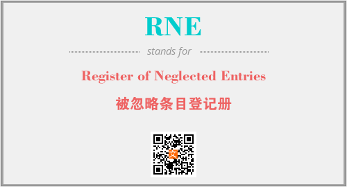 上述内容是“Register of Neglected Entries”作为“RNE”的缩写,解释为“被忽略条目登记册”时的信息,以及英文缩略词RNE所代表的英文单词,其对应的中文拼音、详细解释以及在英文中的流行度和相关分类、应用领域及应用示例等。
