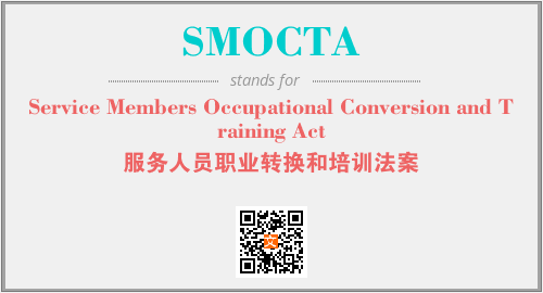 上述内容是“Service Members Occupational Conversion and Training Act”作为“SMOCTA”的缩写,解释为“服务人员职业转换和培训法案”时的信息,以及英文缩略词SMOCTA所代表的英文单词,其对应的中文拼音、详细解释以及在英文中的流行度和相关分类、应用领域及应用示例等。