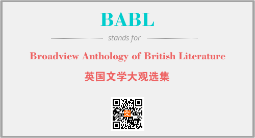 上述内容是“Broadview Anthology of British Literature”作为“BABL”的缩写,解释为“英国文学大观选集”时的信息,以及英文缩略词BABL所代表的英文单词,其对应的中文拼音、详细解释以及在英文中的流行度和相关分类、应用领域及应用示例等。